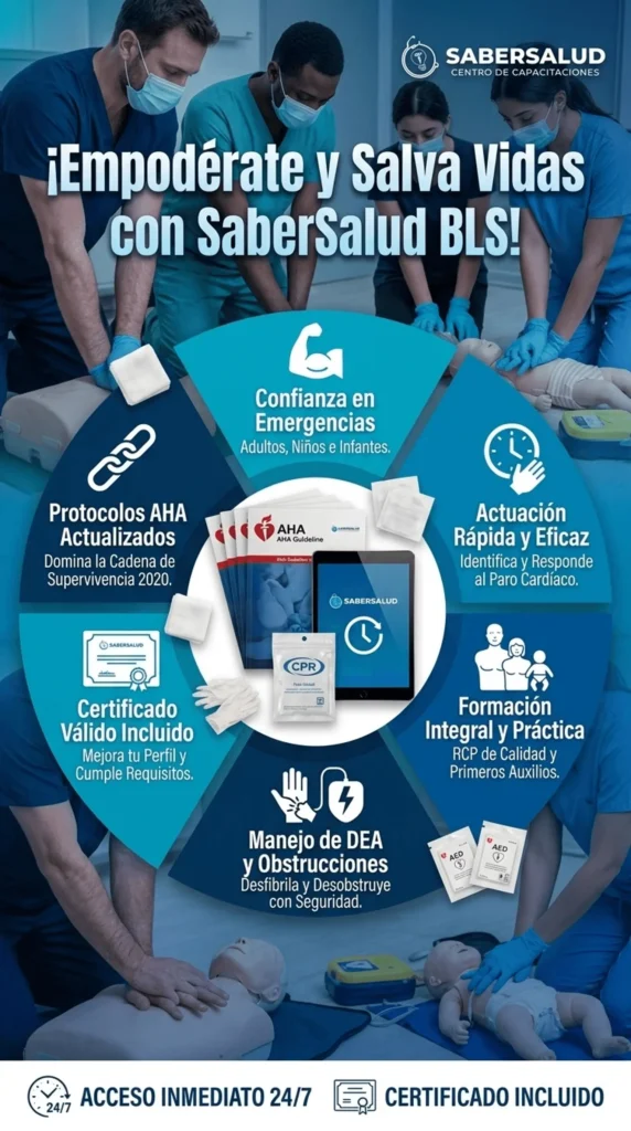 Aprenderás los fundamentos del soporte vital básico según lineamientos AHA, la cadena de supervivencia, técnicas de compresiones y ventilaciones, manejo del DEA en adultos, niños y lactantes, atención de obstrucción de la vía aérea por cuerpo extraño y actualizaciones AHA 2024.